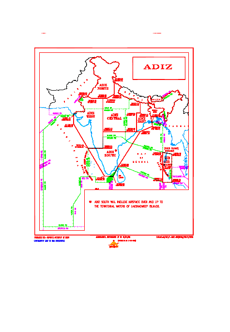 A.D.I.Z South: The entire airspace over the area bounded by coordinates 192003.1N 0755956.3E, 150004.4N 0755956.4E, 150004.4N 0715958.2E, 074006.5N 0762456.3E, 073506.5N 0784455.3E, 100005.9N 0795454.7E, 192003.5N 0855951.7E, 192003.1N 0755956.3E. A.D.I.Z South also includes airspace over and upto the territorial waters of Lakshadweep Islands. |